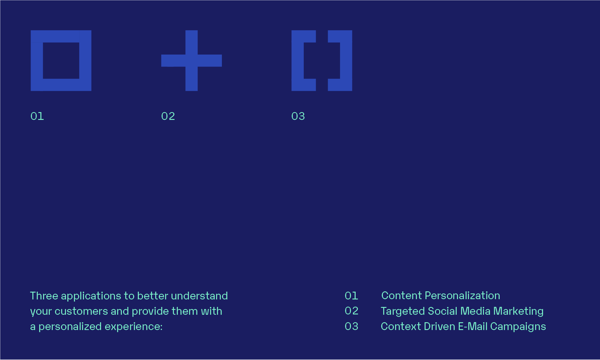 Wer seine Daten versteht, versteht seine Kunden. Und Verstanden-Werden erzeugt Bindung. Die KI-Technologie von Uptrendz erschafft aus Daten Inhalte und hilft Unternehmen auf diesem Weg, ihre User nicht nur zu verstehen, sondern diesen auch eine entsprechende personalisierte Customer Experience zu liefern, basierend darauf wie diese zuvor auf der Plattform interagiert haben. Das Gestaltungskonzept wandelt das wissenschaftlich entwickelte Software Framework in ein visuell erfassbares Erscheinungsbild um. Lose Datensätze erhalten Form und werden erfassbar – Inhalt entsteht. Die signifikante Schriftwahl im Zusammenspiel mit der Raster-Grafik kommuniziert die technische Expertise. Ausgehend von der Formsprache des Logos wurden Grafiken für die drei Applicationen von Uptrendz entwickelt. Dabei stellen die Grafiken den jeweiligen Use Case der Application in einer vereinfachten und aufs wesentliche reduzierten Form dar.